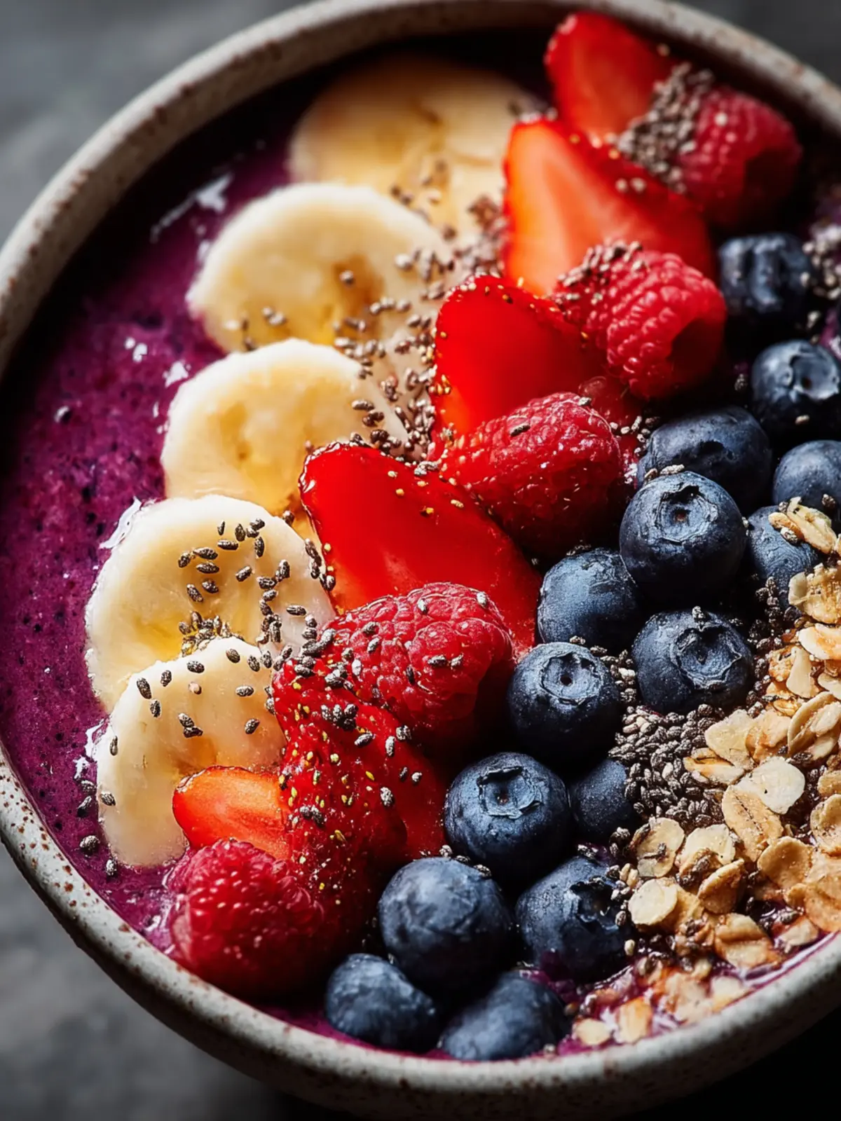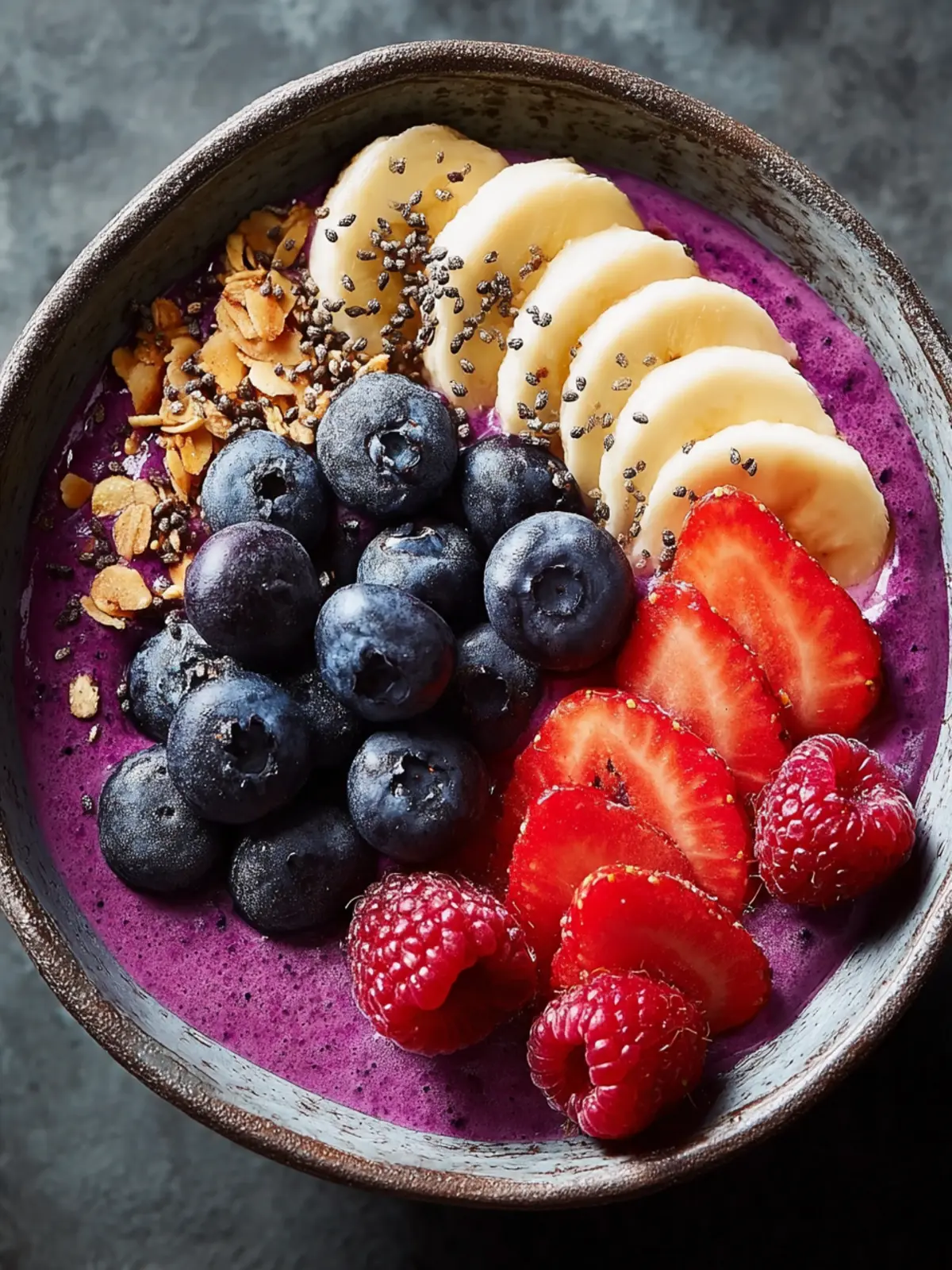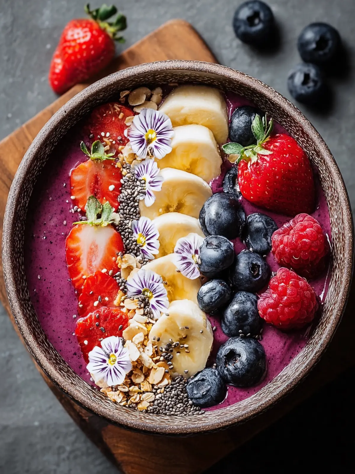 A refreshing and nutritious acai berry smoothie bowl topped with fresh fruits and granola.