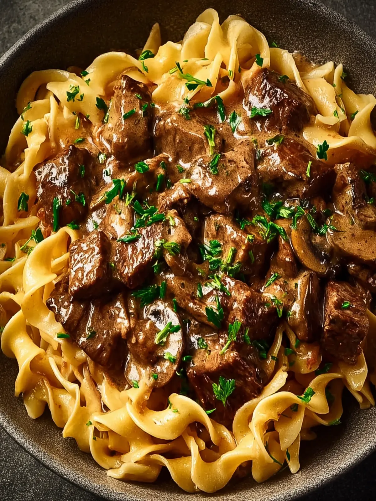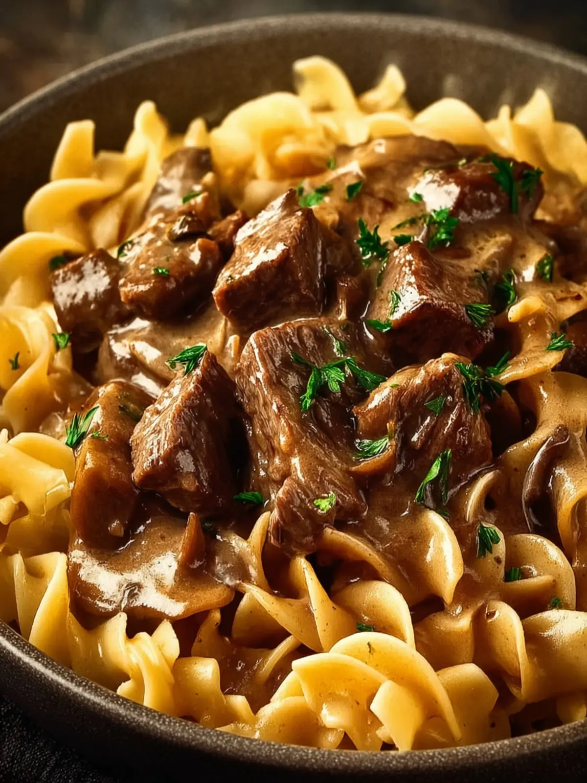 A creamy and savory beef stroganoff served over egg noodles, perfect for a comforting meal.