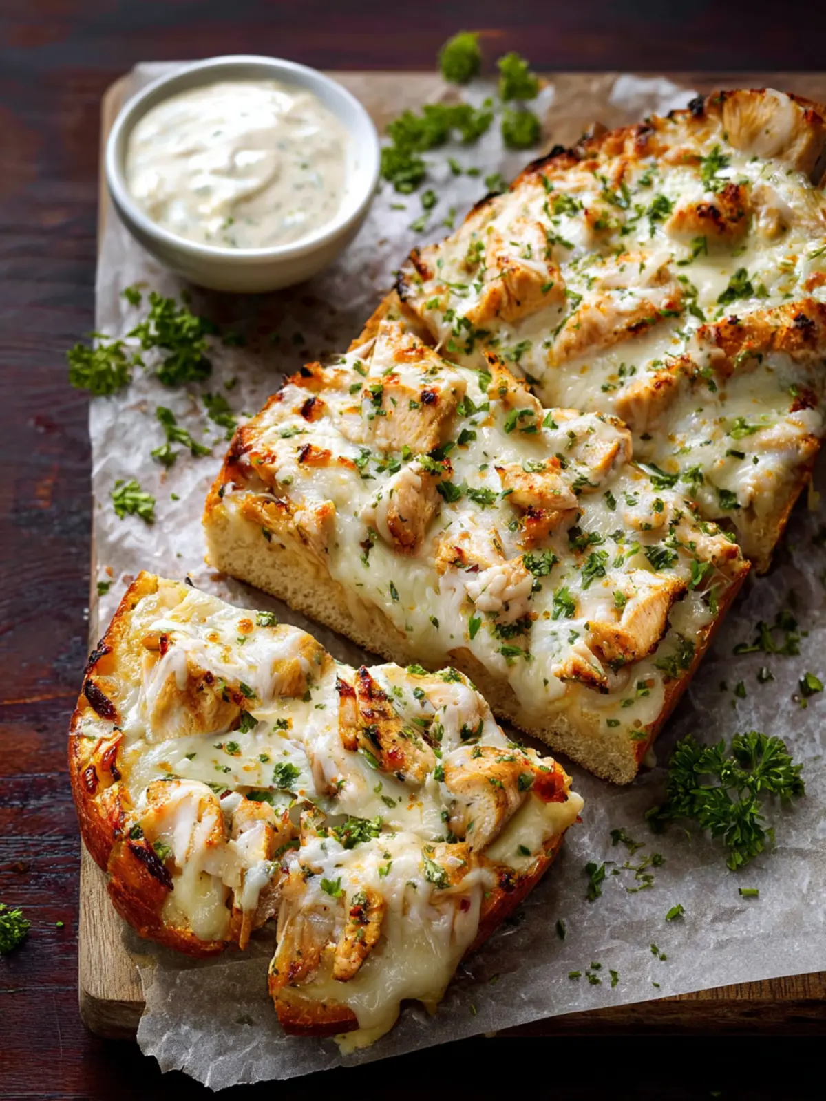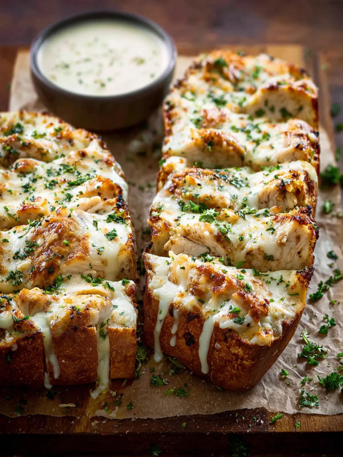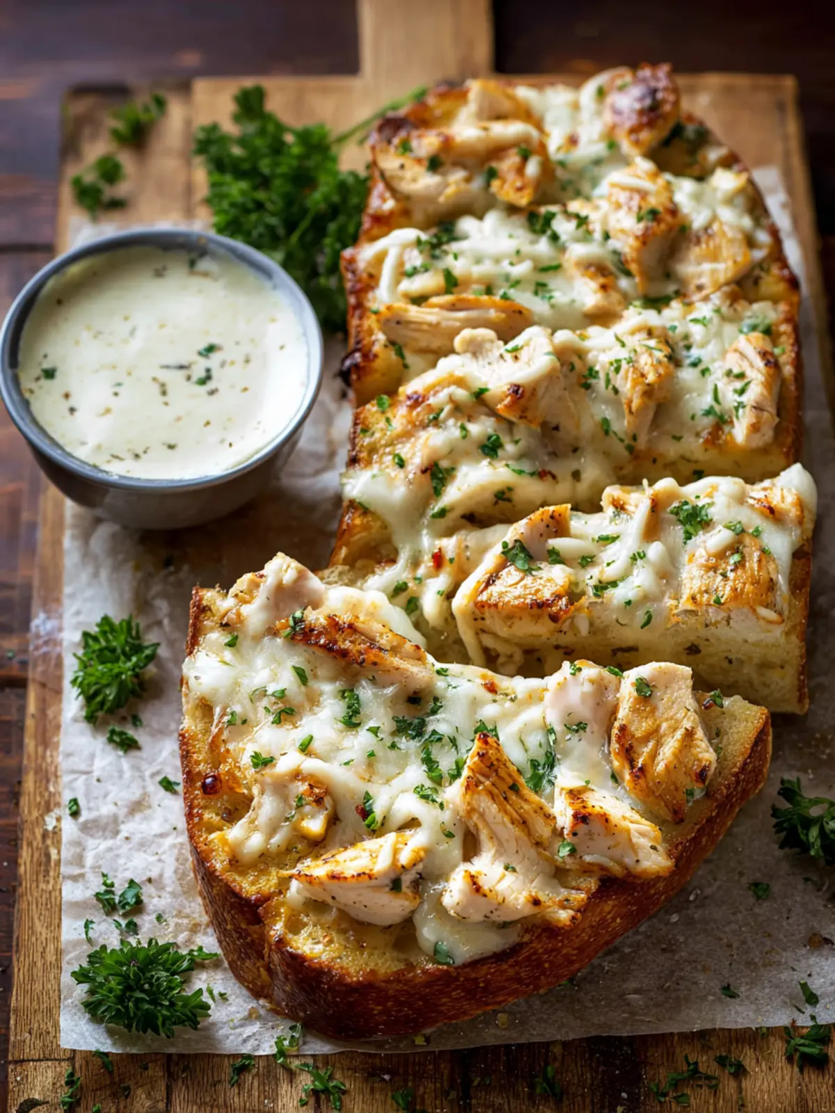 - Garnish with parsley, slice, and serve warm with the reserved Alfredo sauce (reheated if needed) for dipping.