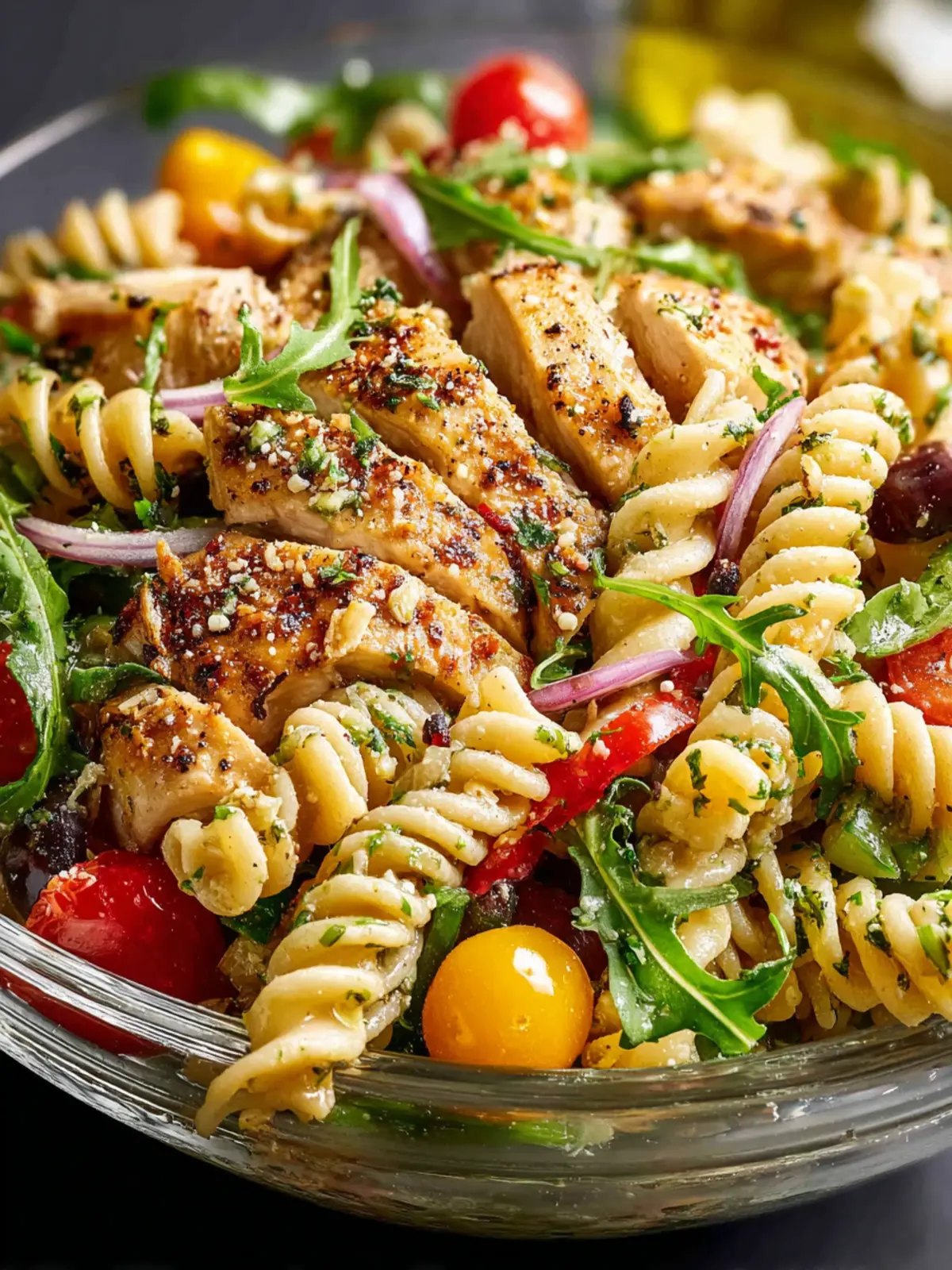 - Transfer the chicken along with any accumulated juices to the pasta bowl. Add the Yellow Bell Pepper, Red Onion, Cherry Tomatoes, Green Olives, Ground Parmesan Cheese, and Arugula.