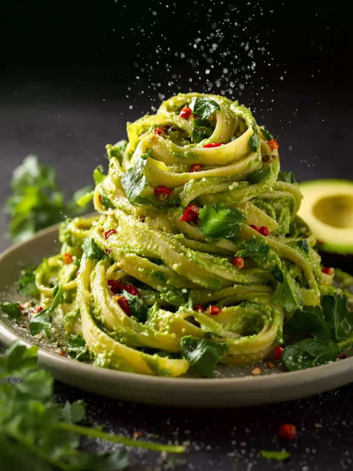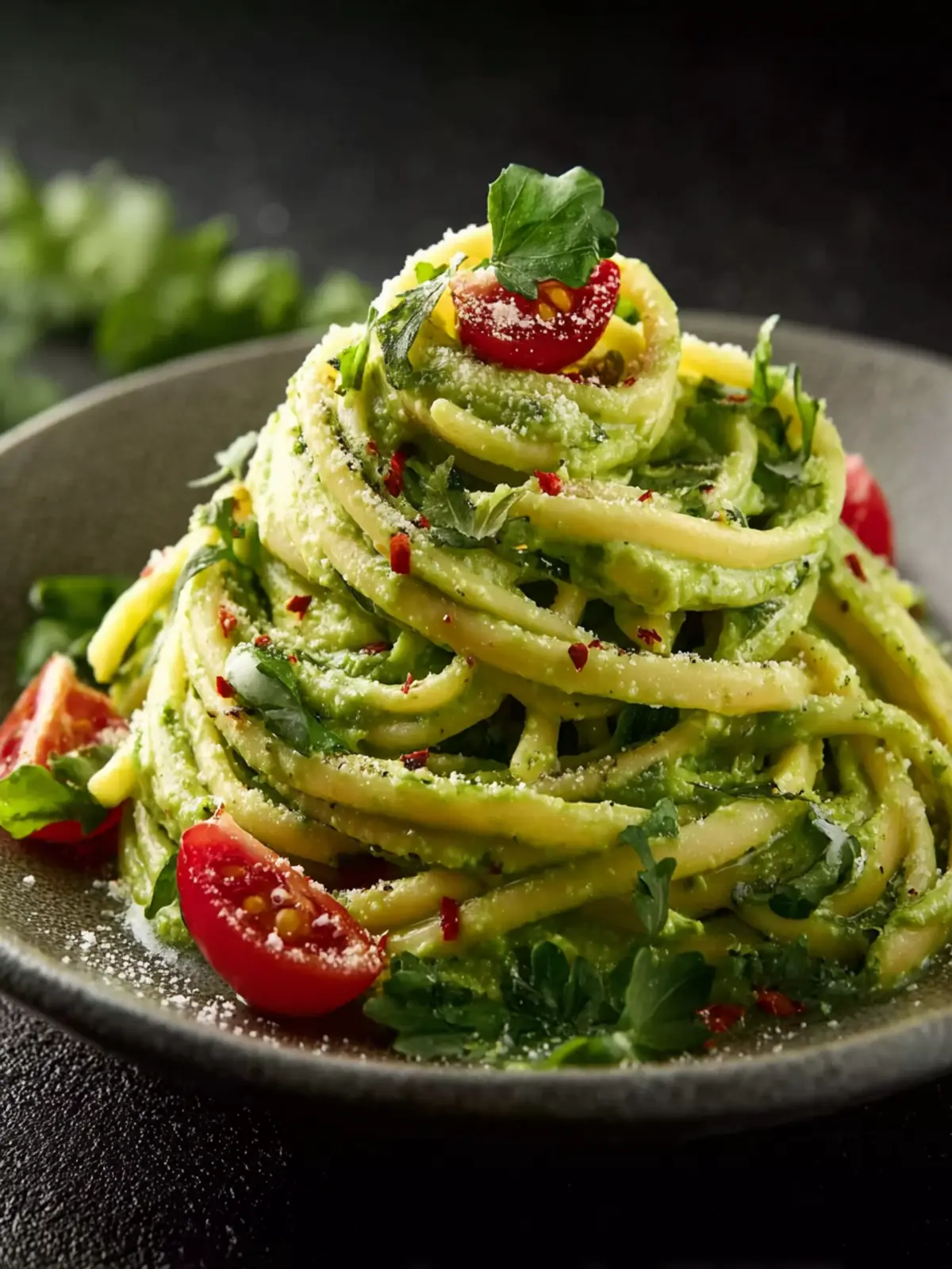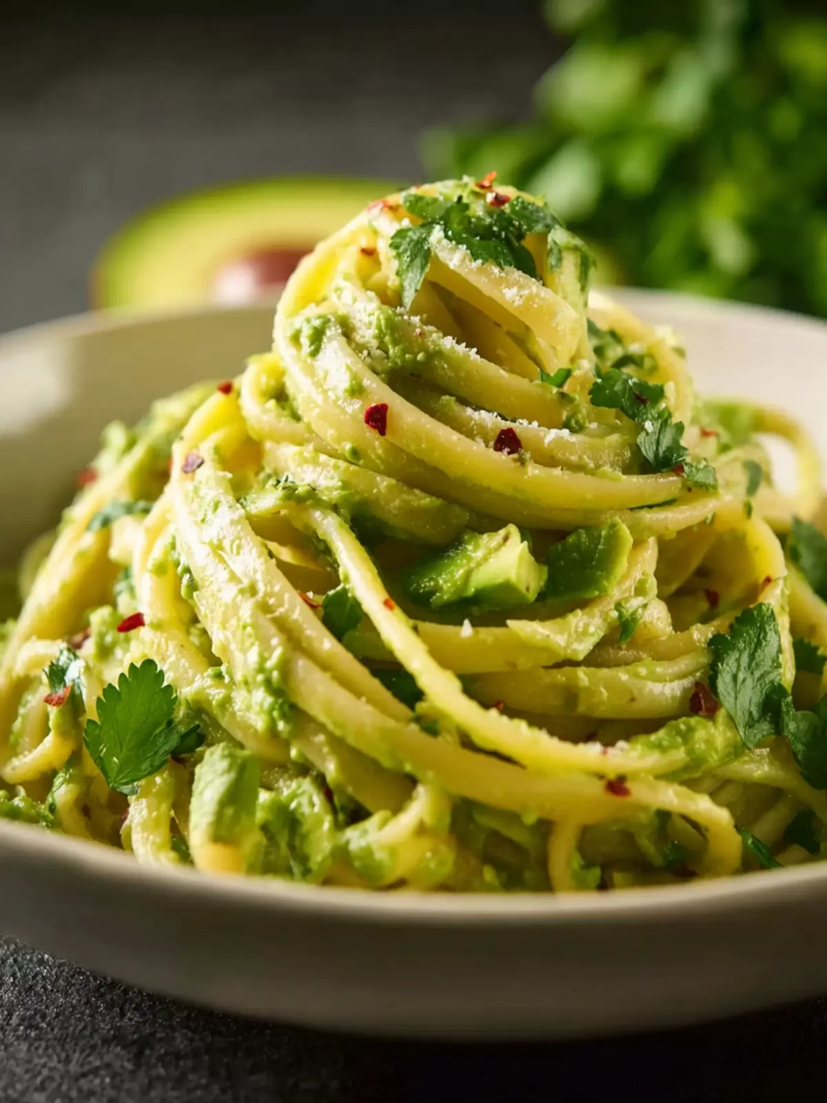 - Serve immediately: Plate the creamy avocado pasta and garnish with cherry tomatoes, a sprinkle of red chili flakes, or a dairy-free parmesan-style topping if desired.