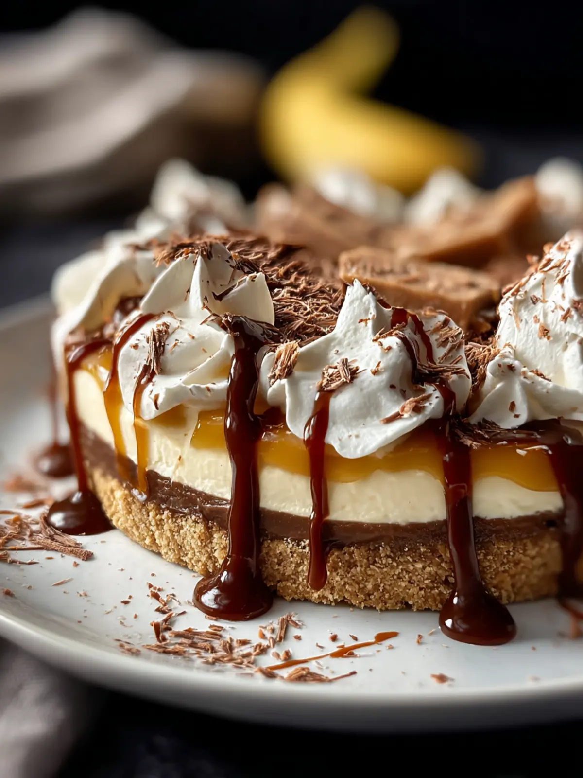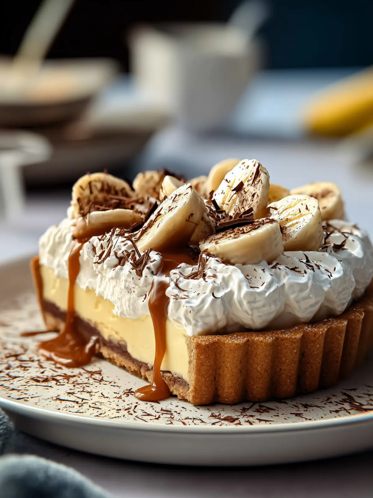 A delicious dessert featuring layers of banana and caramel on a biscuit crust, topped with whipped cream and chocolate shavings.