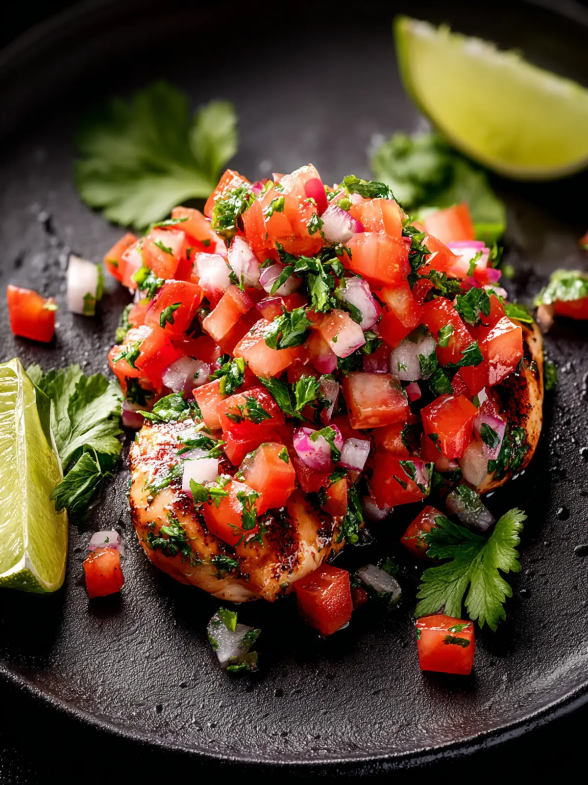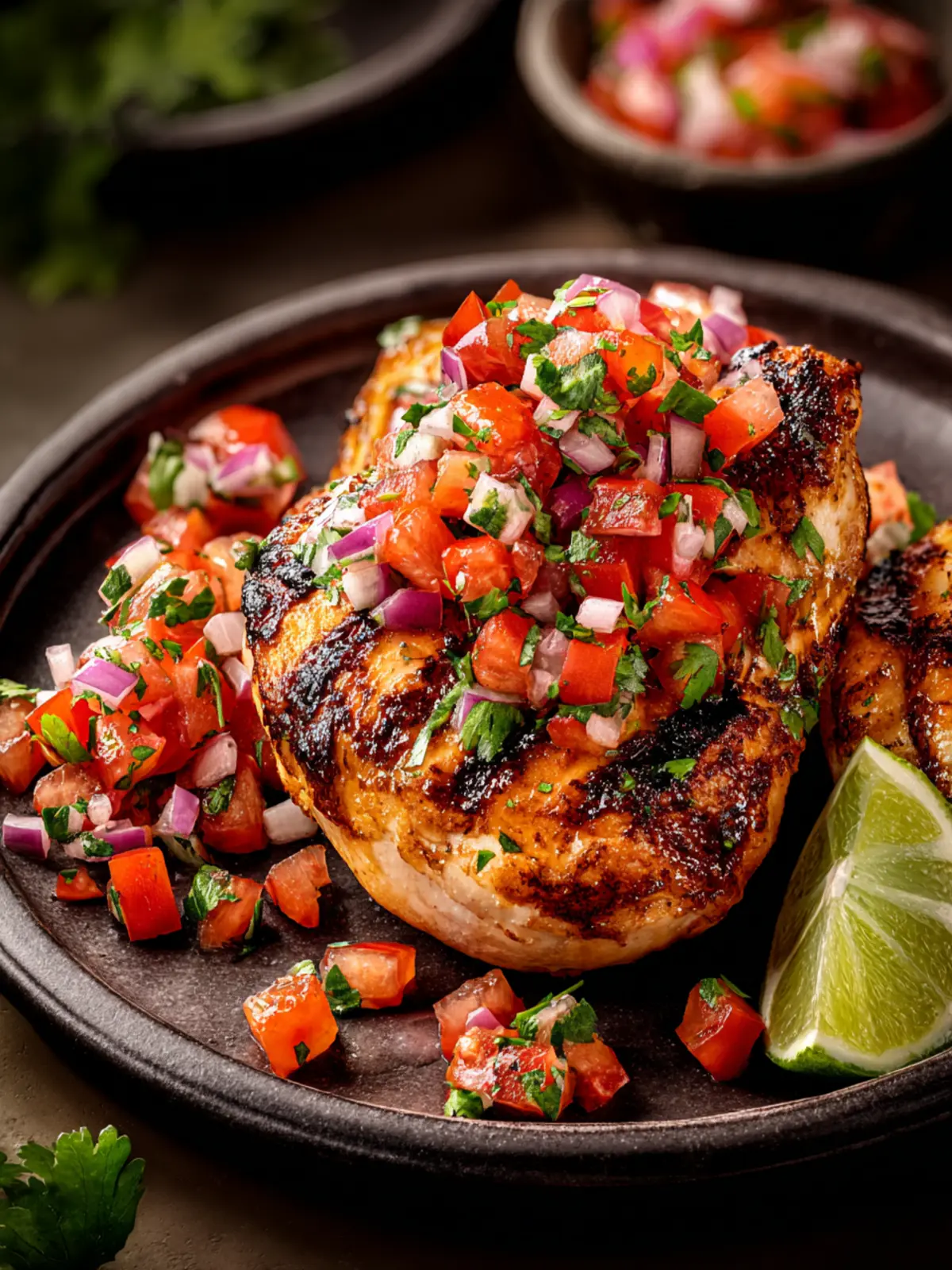 A delicious grilled chicken topped with fresh pico de gallo, perfect for a healthy meal.