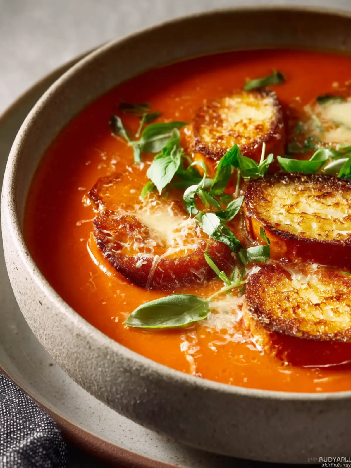 A comforting roasted tomato soup paired with crispy Gruyère toast, perfect for cozy evenings.
