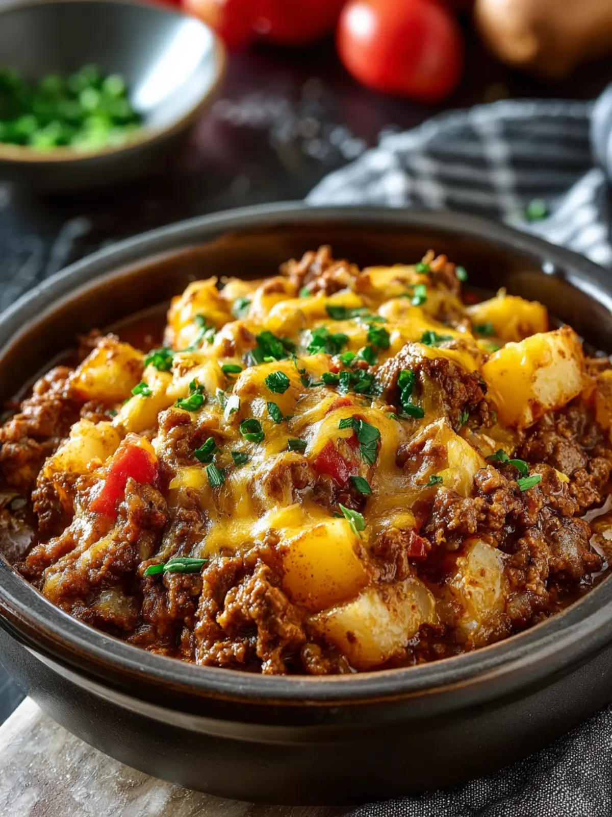 This hearty slow cooker beef and potato casserole is perfect for a comforting meal.